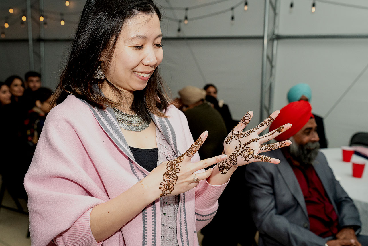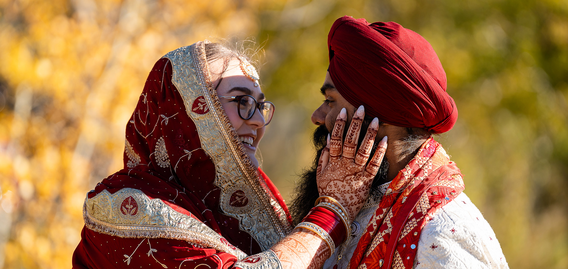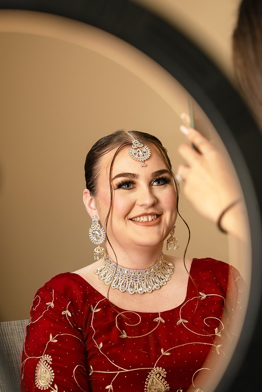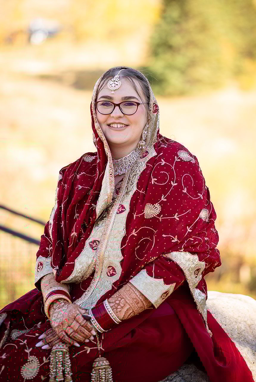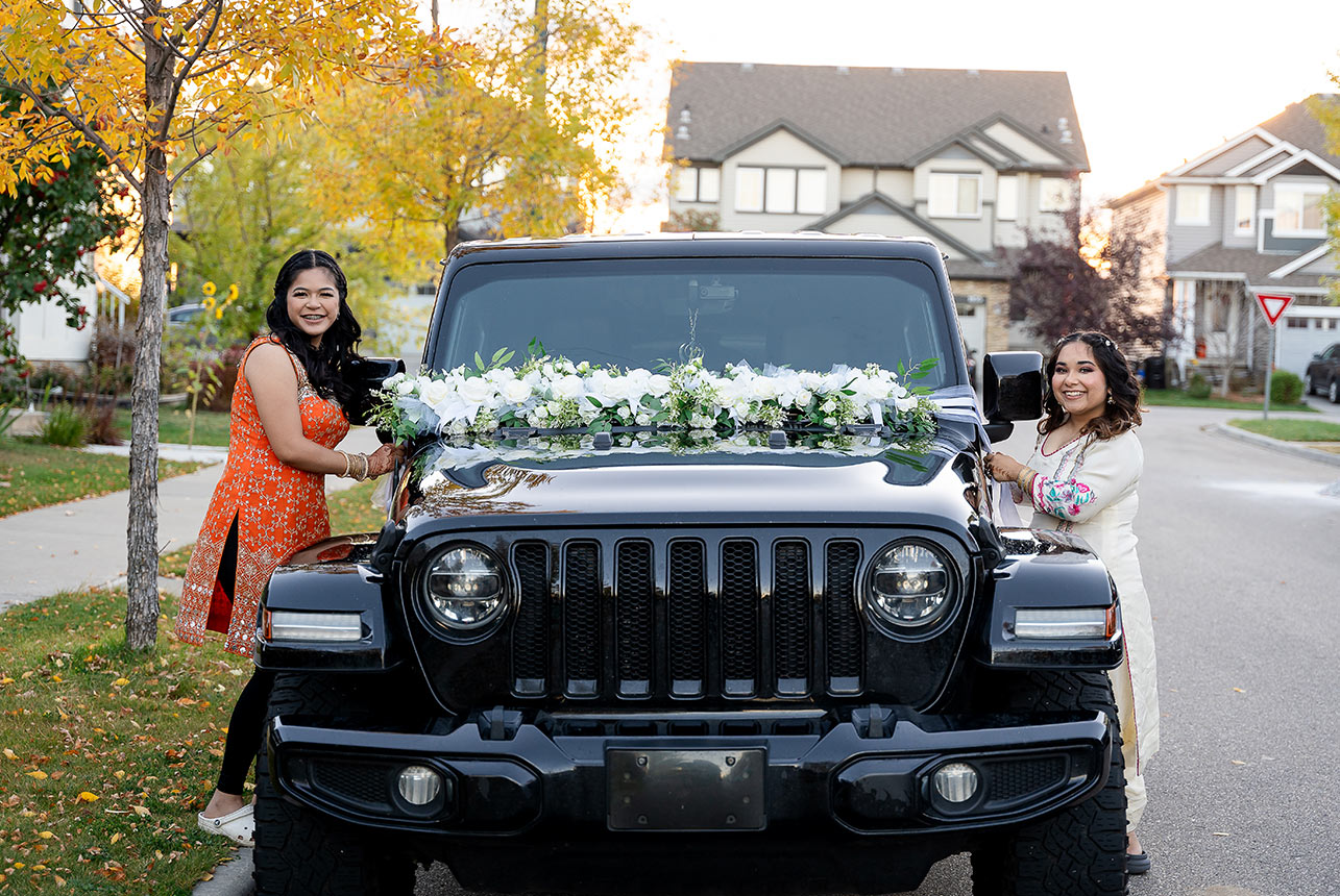 The day began in Emma and Gagandeep’s cozy Edmonton home, where the excitement and anticipation filled every room. Emma’s intricate henna artwork glowed under soft morning light as her closest friends helped with final touches, while Gagandeep’s family carefully adjusted the beads and Kalgi on his regal deep red turban. The air was rich with the scent of fresh flowers, laughter, and the quiet hum of traditional music, setting the tone for a day full of love and tradition.